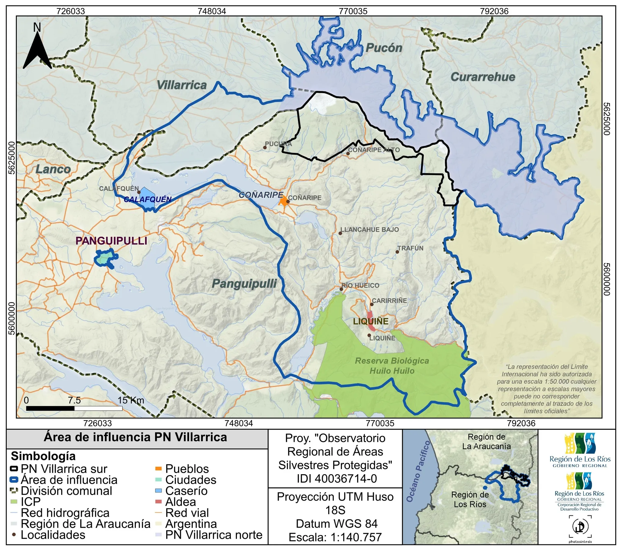 El Parque Nacional Villarrica es parte de la Reserva de la Biosfera de Los Bosques Templados Lluviosos de los Andes Australes. Se encuentra en la Región de la Araucanía, en las comunas de Curarrehue (43,4%), Pucón (27,8%) y Villarrica (2,4%), y en la Región de Los Ríos, en la comuna de Panguipulli con una participación del 26,4% (MMA, 2023). Específicamente se ubica al sur del lago Villarrica y al este del lago Calafquén. El ingreso al Parque Villarrica sector sur (región de Los Ríos) se realiza desde Coñaripe por Los Cajones, el cual se encuentra a 21 km y a 58 km desde Panguipulli (Corporación Nacional Forestal, 2013b).