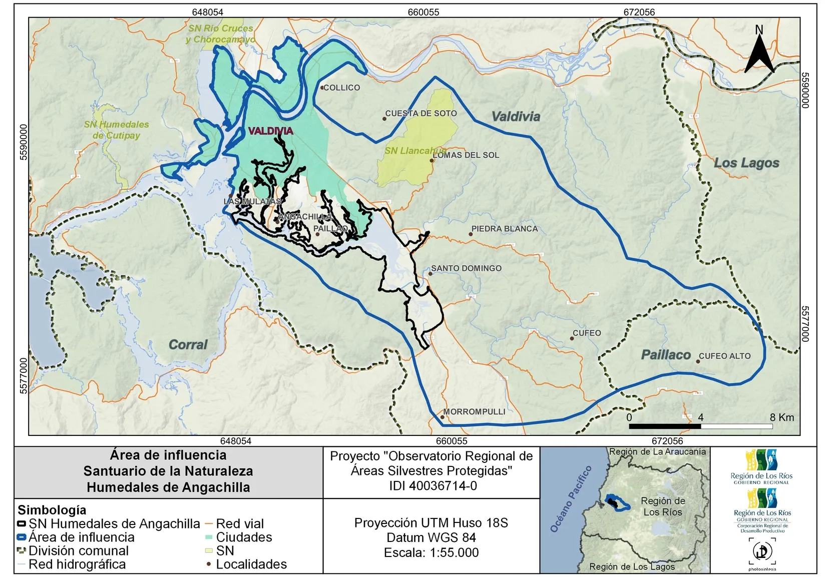 El Santuario de la Naturaleza Humedales de Angachilla se encuentra en la región de Los Ríos, en la comuna de Valdivia. Específicamente, se ubica en la subsubcuenca del río Angachilla (Tapia, 2014), cuyo sistema de humedales está formado por los esteros Miraflores, Angachilla, Prado Verde, Las Parras, Las Gaviotas, y las lagunas de Santo Domingo (Consejo de Monumentos Nacionales de Chile, 2023a). Debido a que parte del Santuario se localiza en la ciudad de Valdivia, existen accesos a través de algunos parque urbanos como el parque Krahmer y los parque urbanos Catrico I y II (Fundación Centro de los Bosques Nativos FORECOS, 2019). El Santuario fue creado en 2021 (Decreto 28), su superficie oficial y calculada es de 2.025,7 hectáreas (MMA, 2023) y su administración está a cargo de la Corporación Humedales de Angachilla. El Santuario protege y abarca cuatro tipos de ecosistemas de gran importancia para la conservación: humedales palustre, hualves o bosques inundados o pantanosos, bosques ribereños y ecosistemas fluviales.