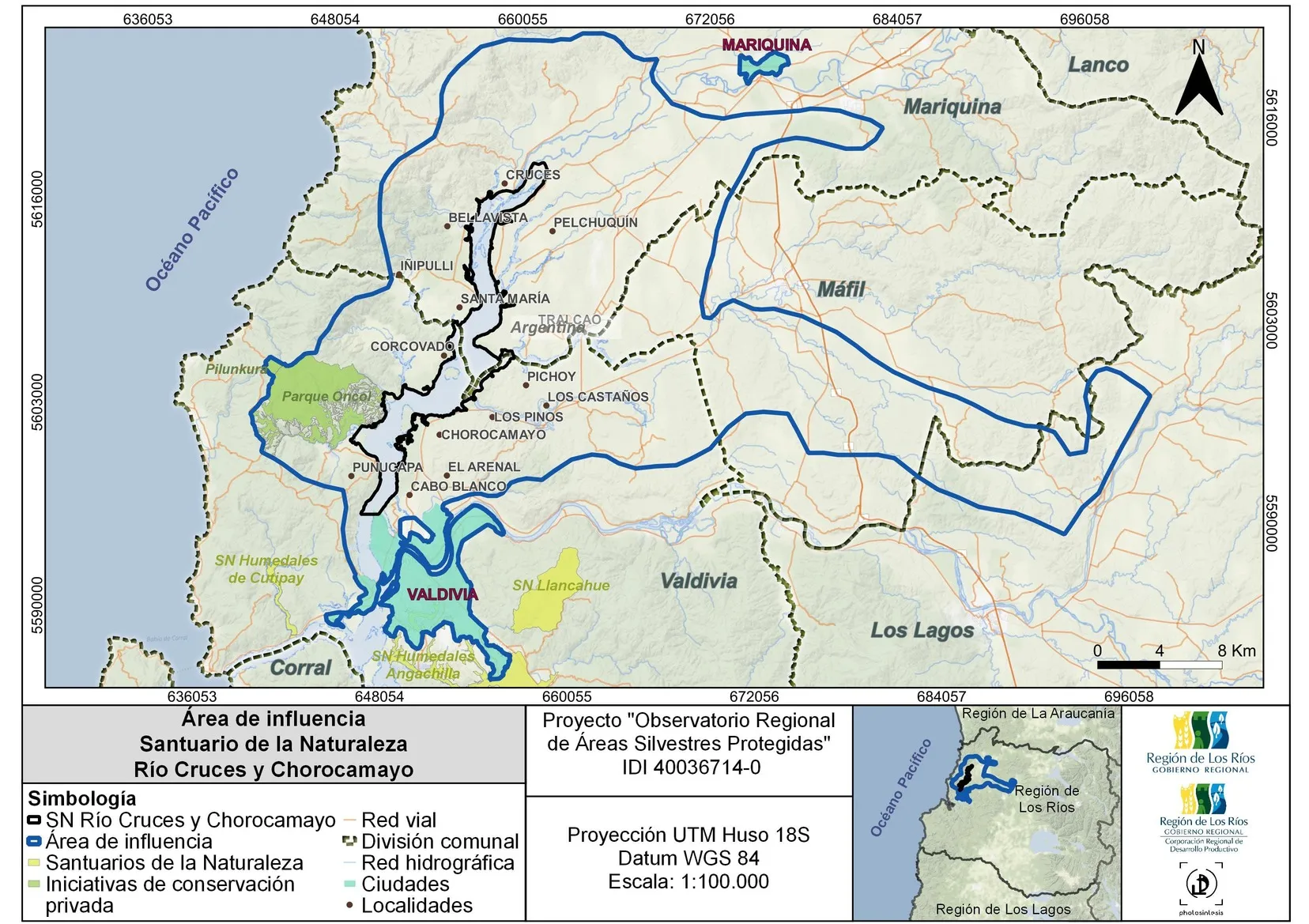 El Santuario de la Naturaleza Río Cruces y Chorocamayo se encuentra en la región de Los Ríos, en las comunas de Valdivia y Mariquina, con una participación de 53,5% y 46,5% respectivamente. Específicamente se ubica en las sub subcuencas: río Cruces entre el estero Quechua y el río Iñaque; río Iñaque (Pichoy) entre arriba del río Máfil y río Cruces y la subsubcuenca del río Cruces entre el río Iñaque y el río Valdivia (Tapia, 2014). Al Santuario se puede acceder vía fluvial desde Valdivia y vía terrestre por Punucapa, a 20,7 km de Valdivia y por Castillo San Luis de Alba, a 21,2 km de San José de Mariquina (Parque Los Ríos, 2023).